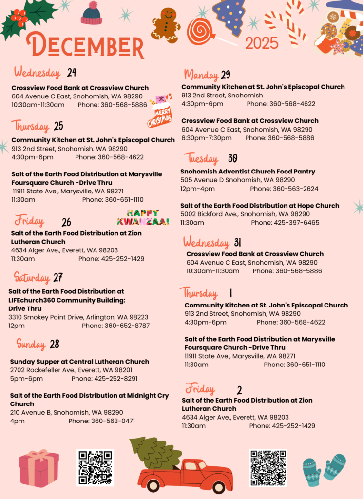 For a listing of food banks throughout Snohomish County, visit: snohomishcountyfoodbankcoalition.org